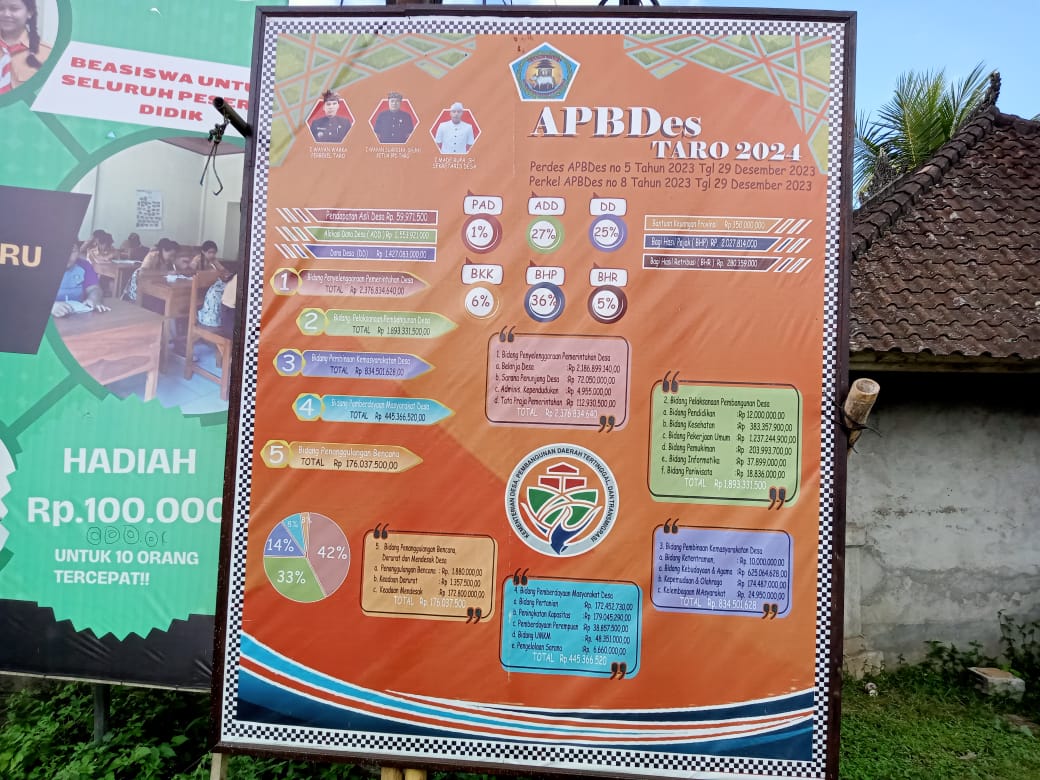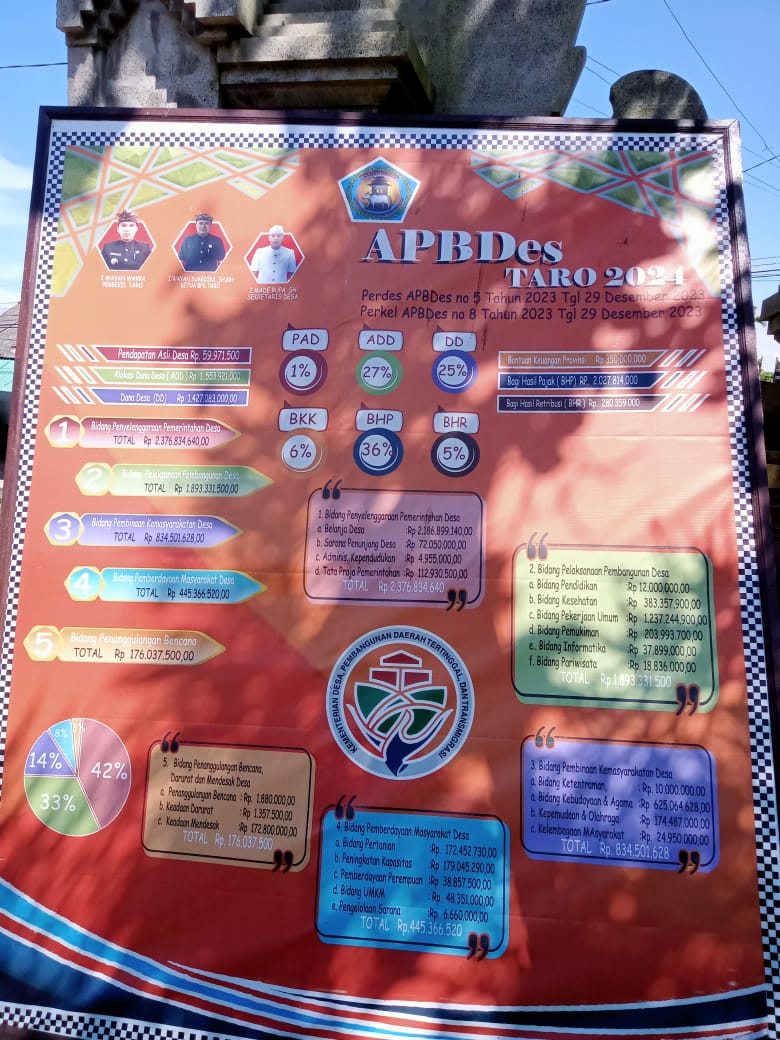 Kedua dokumen keuangan tersebut kini terpajang di berbagai titik strategis wilayah Desa Taro di antaranya di Kantor Desa, Balai Banjar, serta area pelayanan publik dan pusat keramaian masyarakat. Langkah ini menegaskan bahwa Pemerintah Desa Taro tidak hanya sekadar transparan, tetapi benar-benar bersih dari praktik korupsi melalui sistem pengelolaan keuangan desa yang jujur, terbuka, dan dapat dipertanggungjawabkan.