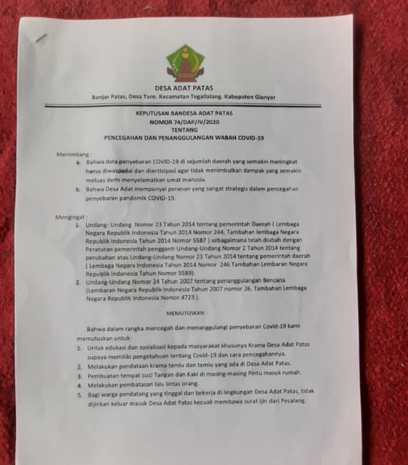 Patas - Rabu 08 April 2020 | 10.00 AM Dalam Upaya melakukan pencegahan penyebaran COVID-19 (Corona Virus Disease) secara intens, maka Desa Adat Patas Desa Taro Tegallalang Gianyar melalui Satgas Desa Adatnya memiliki inisiatif dan melakukan upaya pencegahan Covid-19 dengan melakukan sosialisasi dan pembagian masker secara gratis kepada seluruh warga.