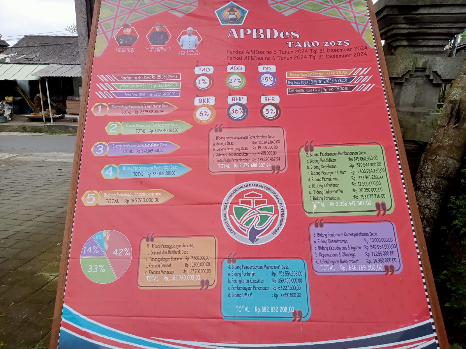 - Pelaksanaan Pembangunan Desa — pembangunan jalan usaha tani, sarana air bersih, prasarana lingkungan, dan penguatan pariwisata berbasis budaya.
