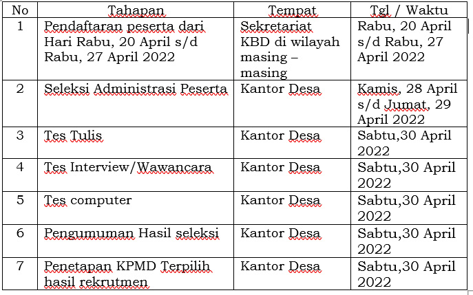 VI. Tujuan perekrutan KPMD adalah untuk memberdayakan masyarakat desa dan memberikan kesempatan untuk mengabdikan diri dalam lingkungan pemerintahan desa serta diberikan kesejahteraan berupa Honor sesuai dengan kemampuan keuangan desa.